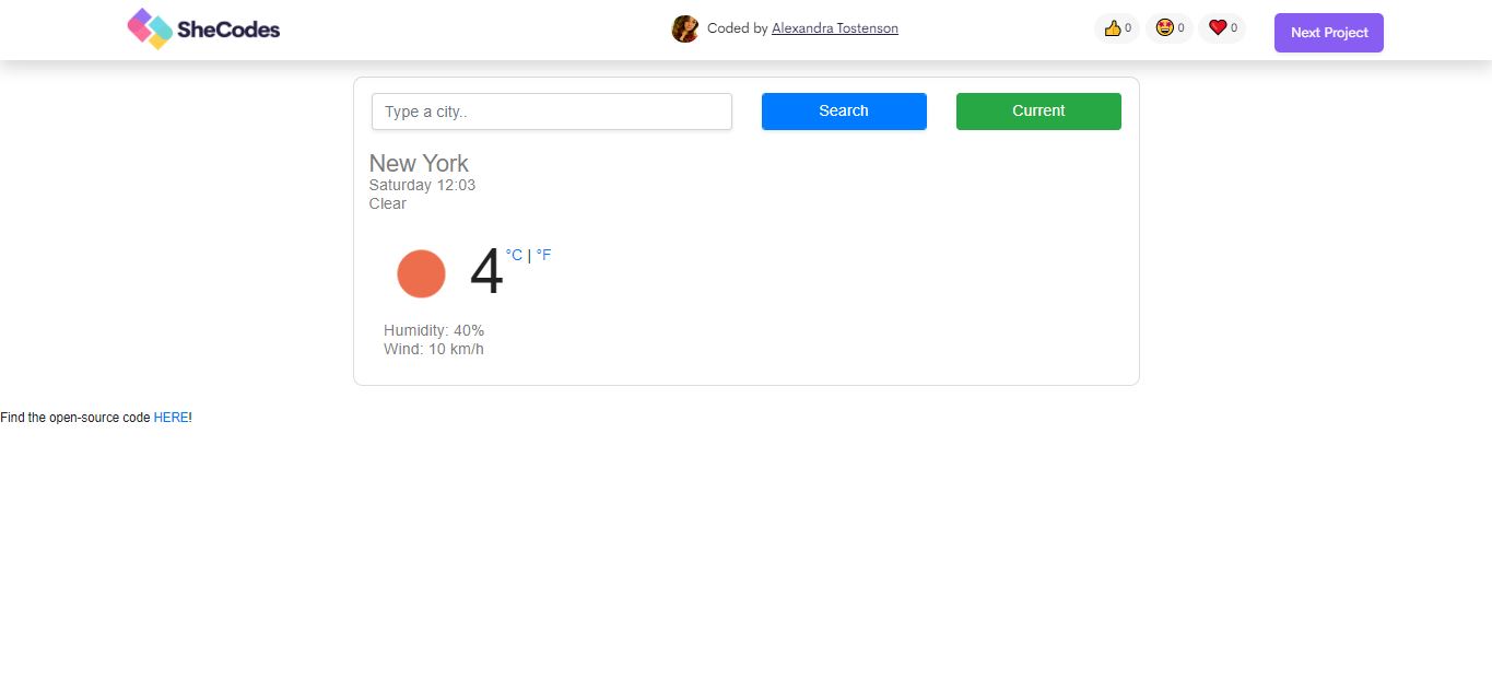 Here you can find a weather app developed by me with the amazing teaching of the SheCodes program. Let me tell you this was not easy but in the end it got done.